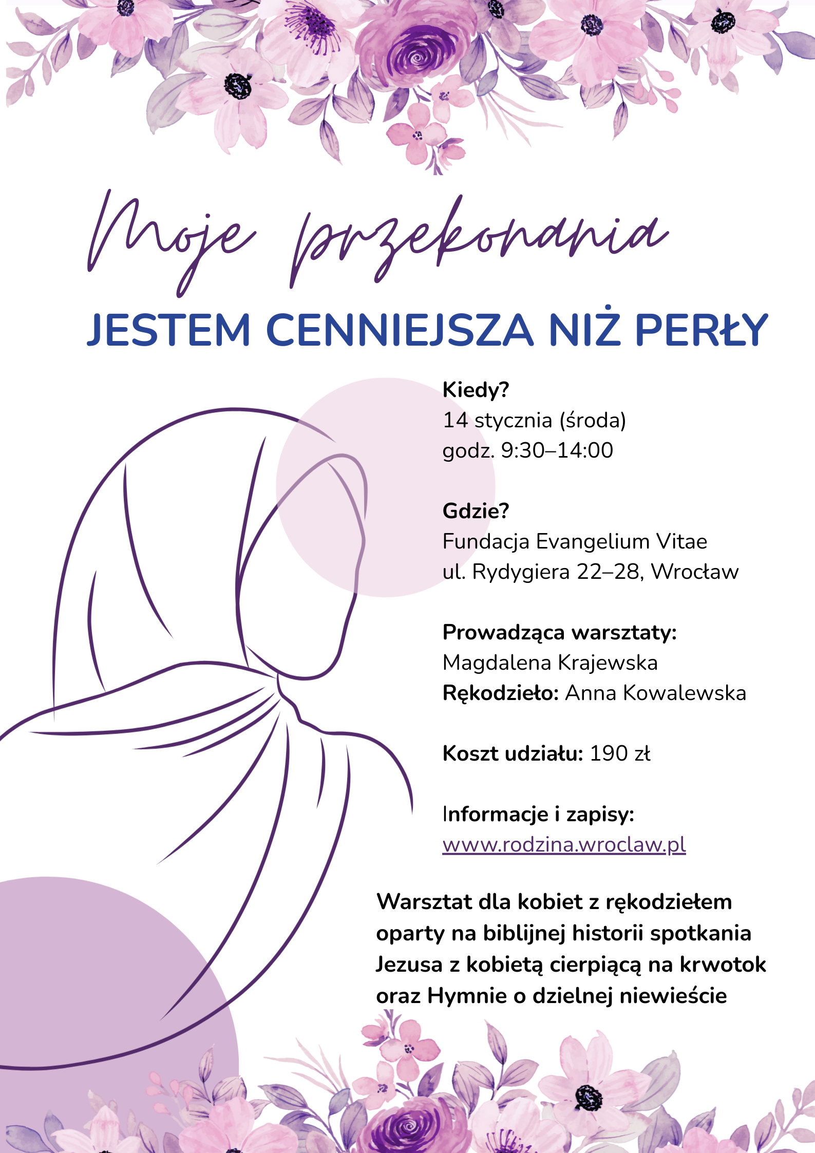 Co:  Warsztat: „Moje przekonania – jestem cenniejsza niż perły” (kontekst Biblijny: hymn o dzielnej niewieście oraz uzdrowienie kobiety cierpiącej na krwotok)