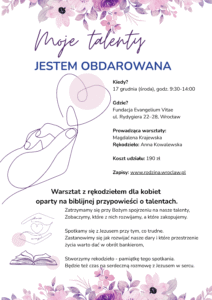 Co:  Warsztat: „Moje talenty – jestem obdarowana przez Króla”