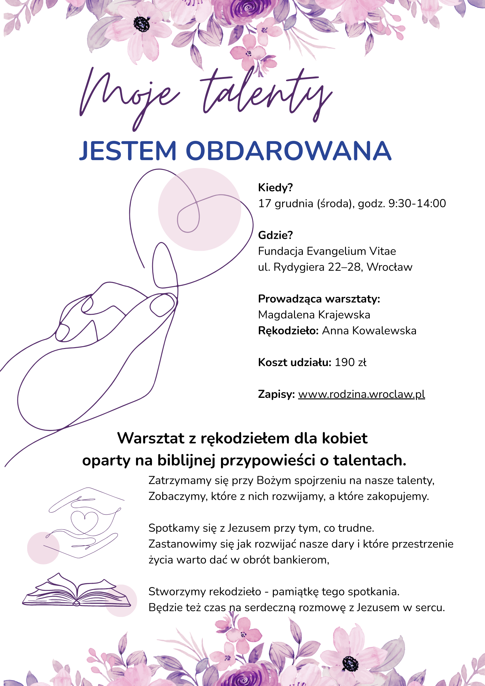 Koszt: 110 zł za spotkanie przy udziale we wszystkich spotkaniach (wtedy płatność sumaryczna 220 zł) lub 120 zł za udział w wybranym temacie. Dodatkowa zniżka dla małżeństw pragnących razem wziąć udział w warsztatach – informacja w formularzu zgłoszeniowym. Gdyby finanse były dla kogoś przeszkodą w uczestnictwie, piszcie do mnie – będziemy rozmawiać i szukać rozwiązań. W razie rezygnacji z zachowaniem minimum 3-dniowego wyprzedzenia zwracamy całą kwotę na konto.