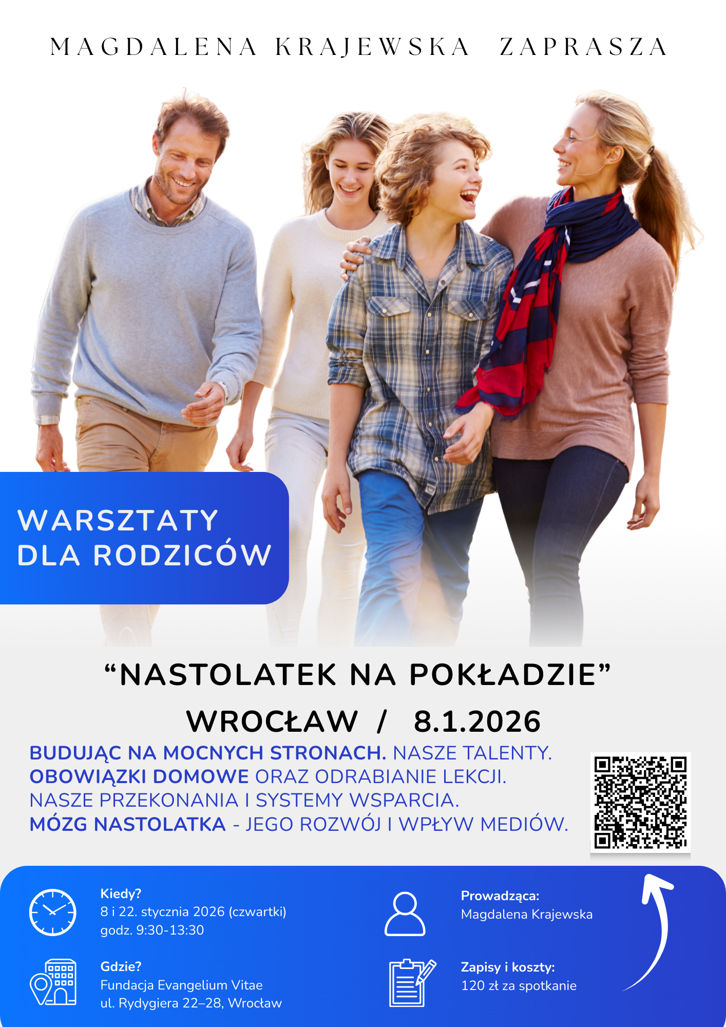 Serdecznie zapraszam na warsztaty dedykowane rodzicom starszych dzieci i nastolatków. Te dwa spotkania pomogą Ci odnaleźć się w nieustannie zmieniającym się świecie Twojego nastolatka. Pomogą wrócić do bliskiej relacji i odtworzyć współpracę opartą na zaufaniu.