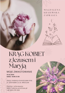 Zapraszam na kolejny już Krąg kobiet z Jezusem. W tym semestrze na kolejnych pięć (luty-czerwiec) spotkań zaprosimy w szczególny sposób do naszych spotkań Maryję. Bedziemy rozważać Słowo Boże dotyczące Radosnych Tajemnic Różańca Świętego i odnosić je do swojego życia. Zaczynamy od Zwiastowania i będziemy chciały zobaczyć w jakim momentach naszego życia doświadczałyśmy naszego zwiastowania. Obowiązują zapisy.