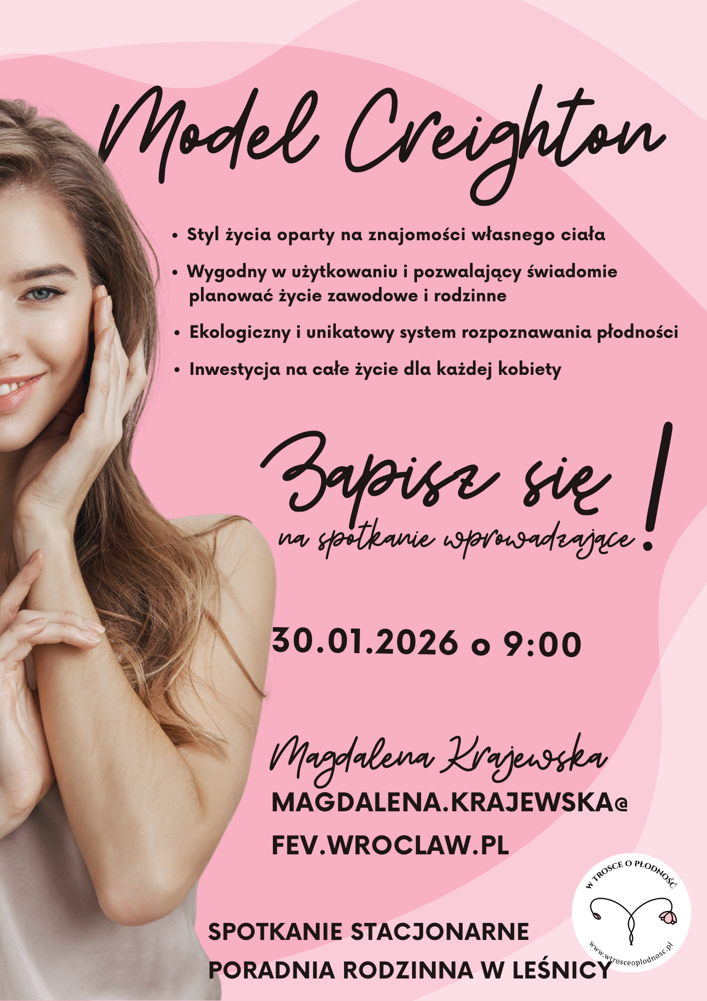 Zapraszam na bezpłatne spotkanie wprowadzające do nauki Creighton Model System w piątek 30.01.2026r o godzinie 9:00 w Poradni Rodzinnej we Wrocławskiej Leśnicy.